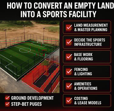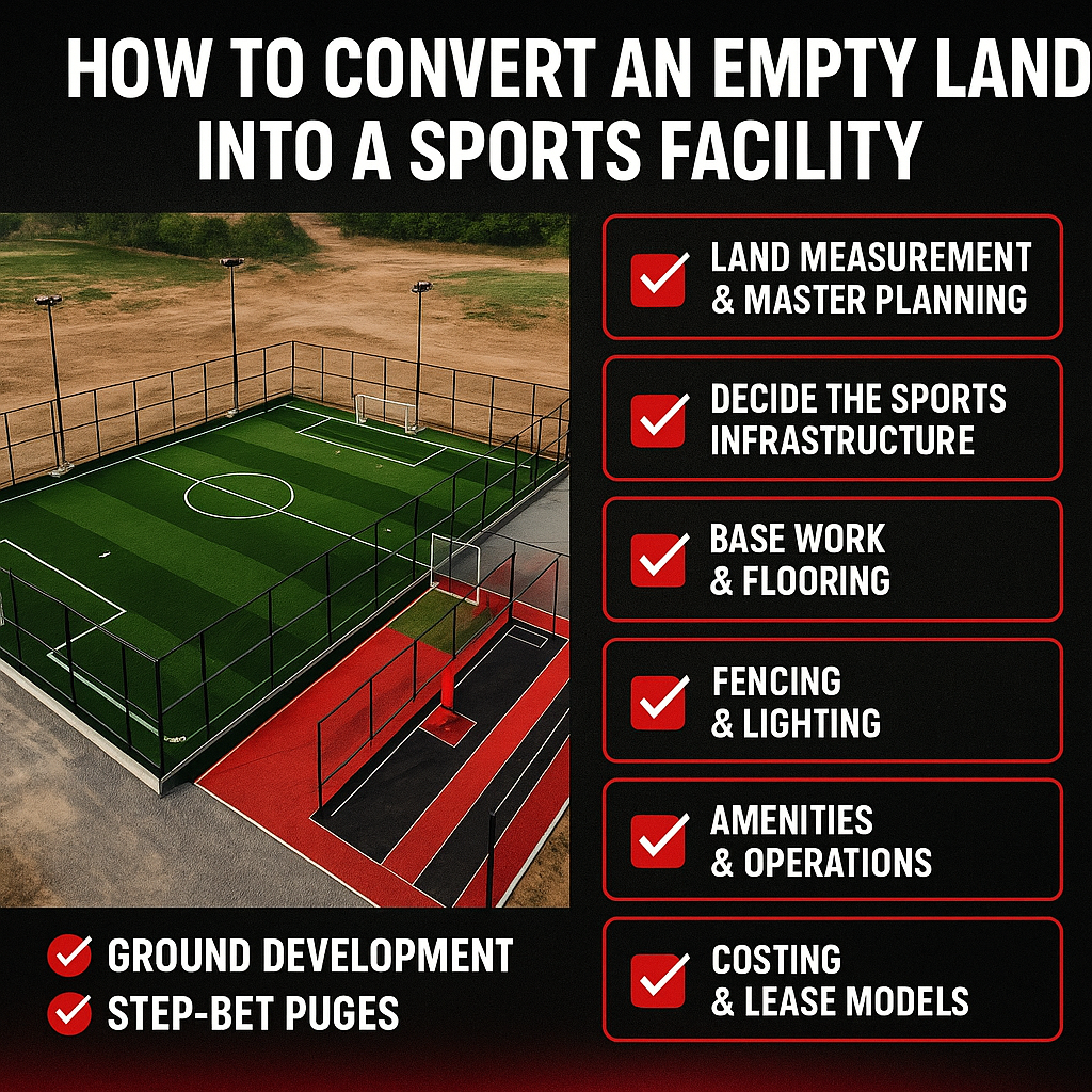 Step-by-step guide to convert empty land into a sports facility in India: turf, cricket nets, courts, skating, shooting range, costing, safety and revenue options.